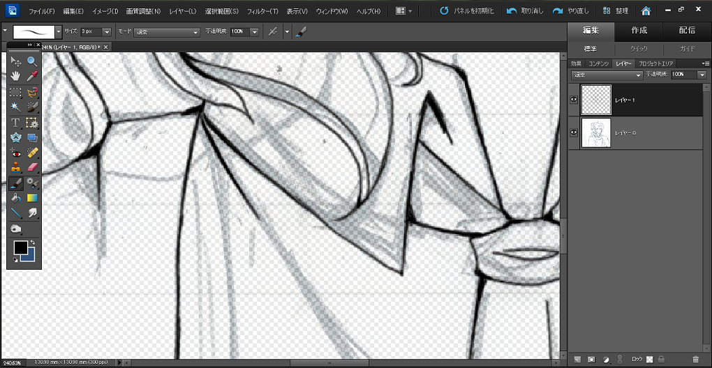拡大してざっかざっかペン入れ。デフォペン先3pxがお気に入り。